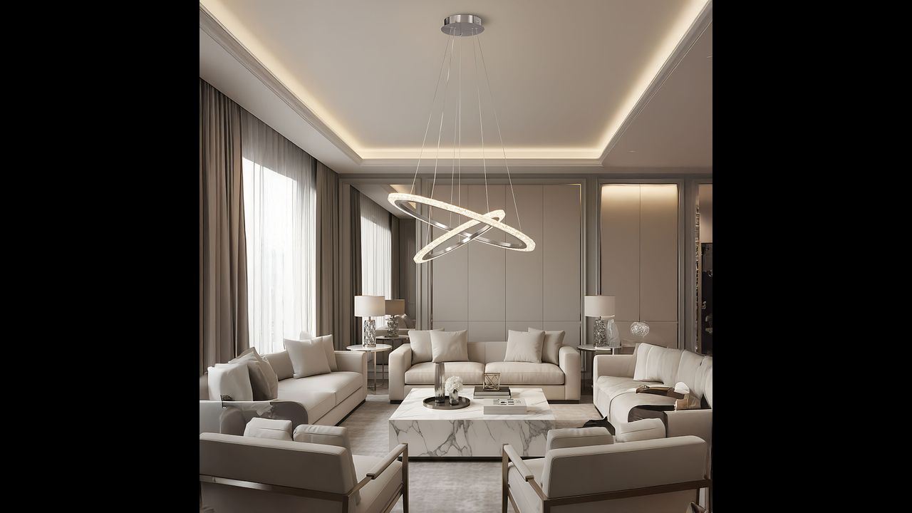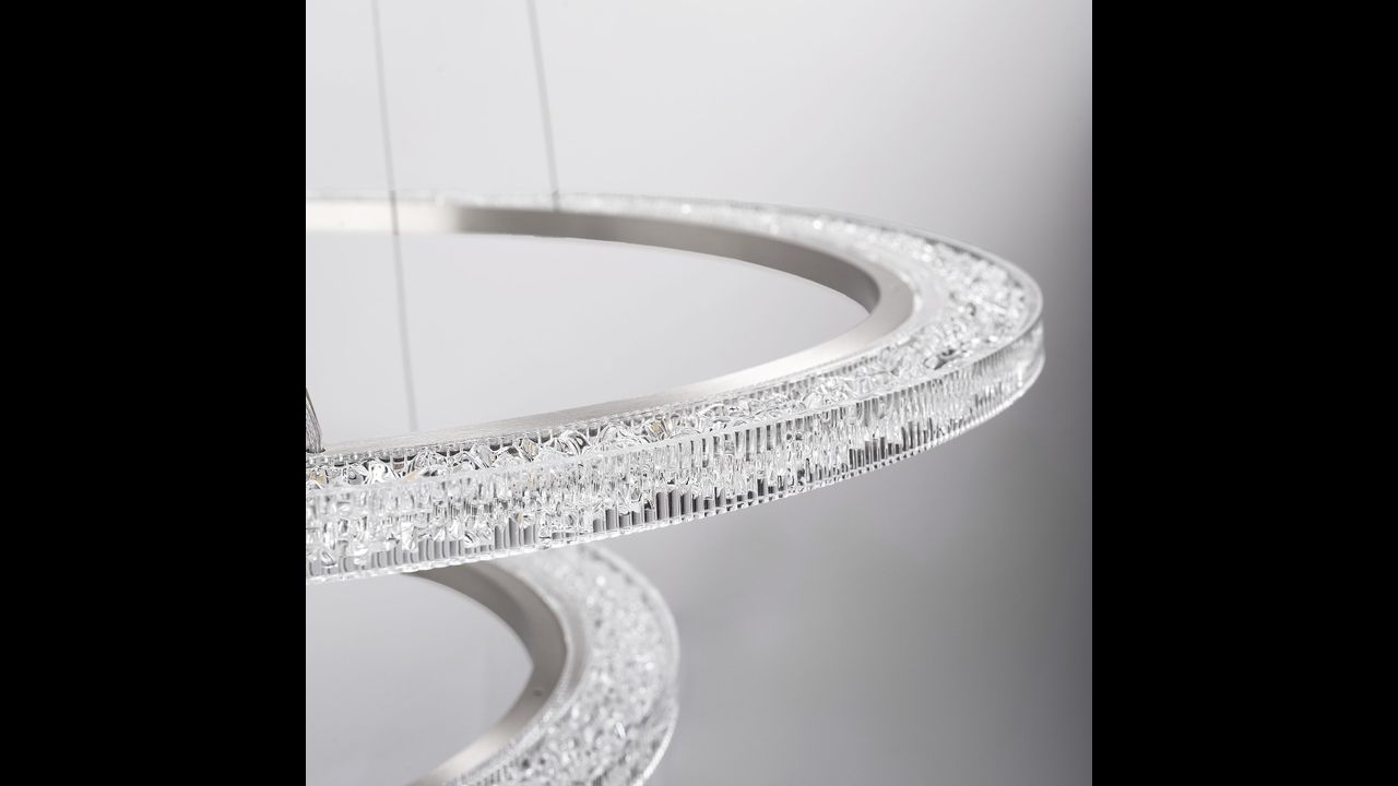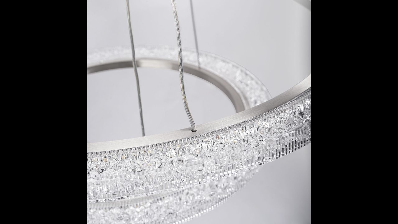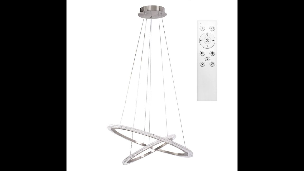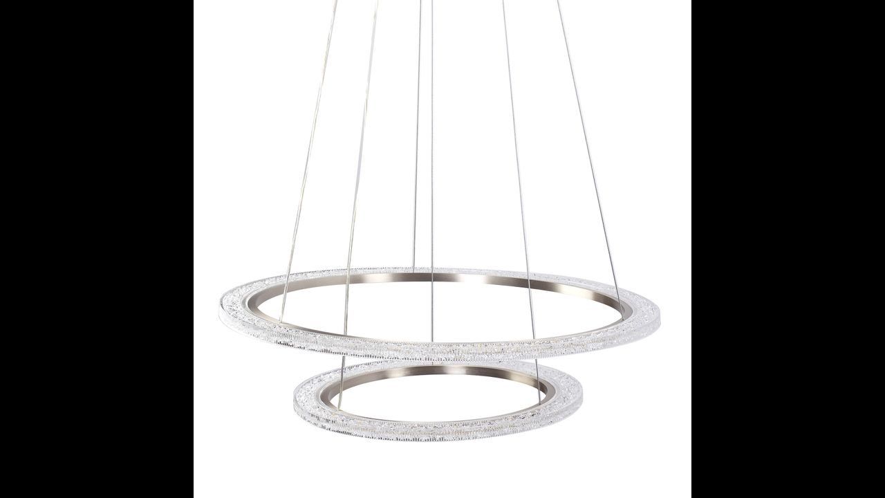 Модерният LED полилей с диаметър на по-големия пръстен 60 см е изключително съчетание между функционалност и дизайн. Двата пръстена с фин блясък на четкан никел образуват елегантна пространствена форма, която е идеална за хола, трапезарията или спалнята. Възможността за регулиране на дължината на кабелите и окачванията позволява подреждане на пръстените паралелно или асиметрично.