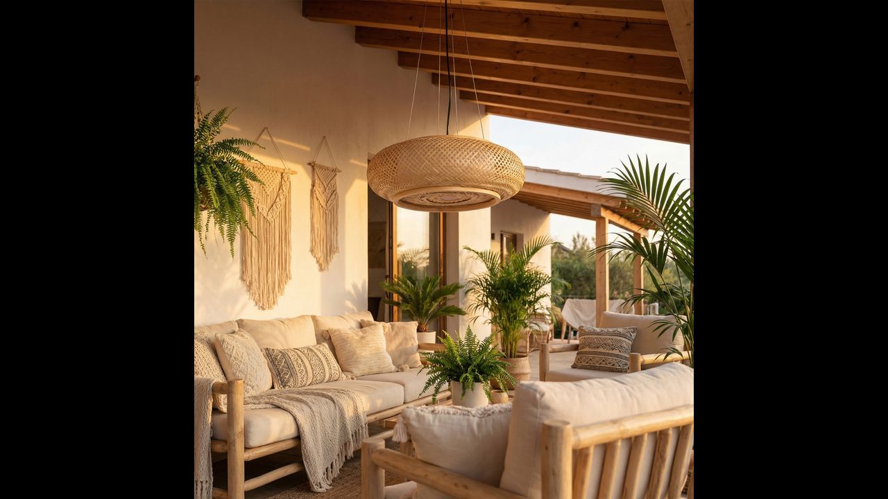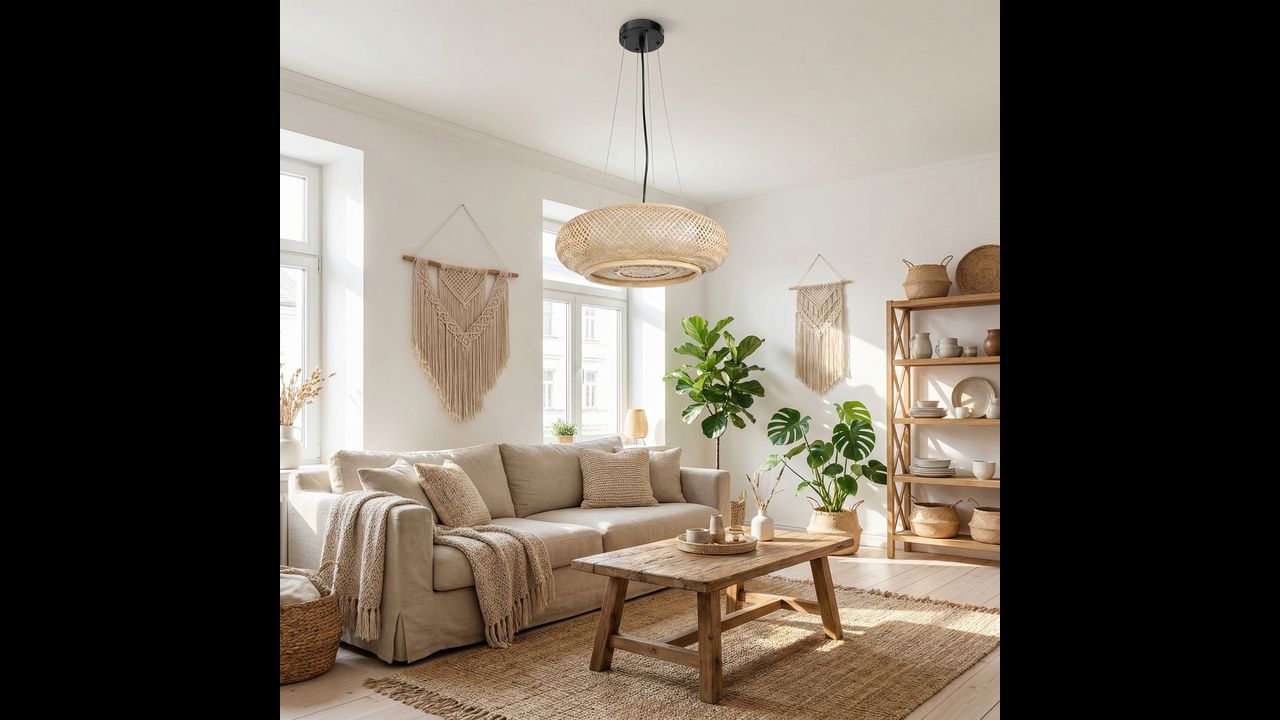 Висящата лампа в стил бохо е уникална комбинация от естествена визия, лека форма и декоративен дизайн, вдъхновен от ръчно плетени мотиви. Нейният широк и впечатляващ абажур в топъл дървесен нюанс създава уютна атмосфера, а ажурната конструкция нежно разпръсква светлината, формирайки мек и приятен ефект.