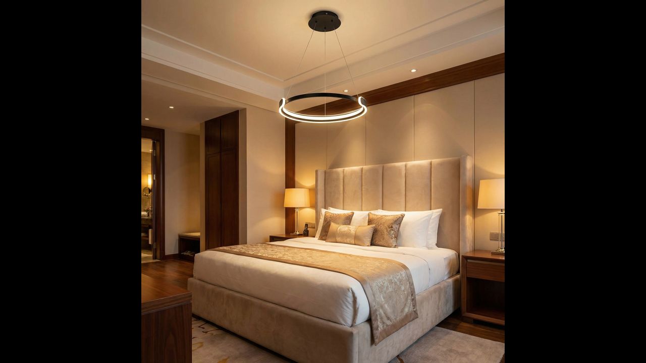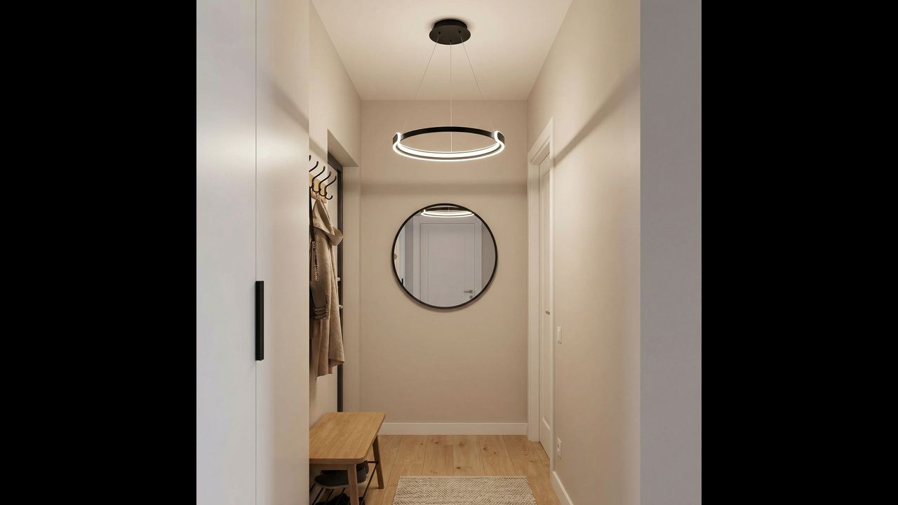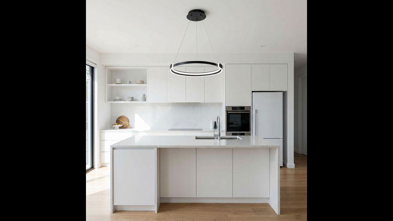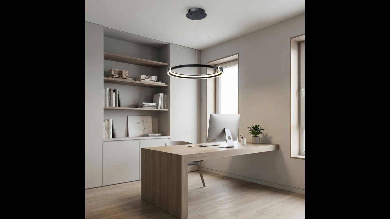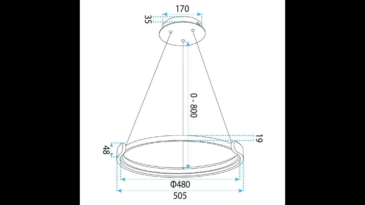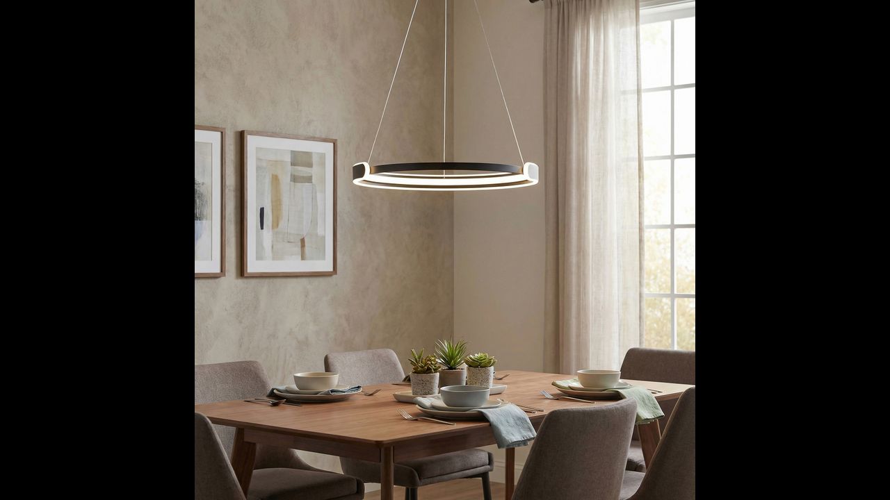 Стройната форма, окачена на тънки кабели, изглежда естетично и леко, без да натоварва пространството, като същевременно служи като декоративен акцент. Интегрираният LED източник осигурява равномерно и комфортно осветление за ежедневна употреба, а светлата линия създава ефектен контраст с тъмната рамка.