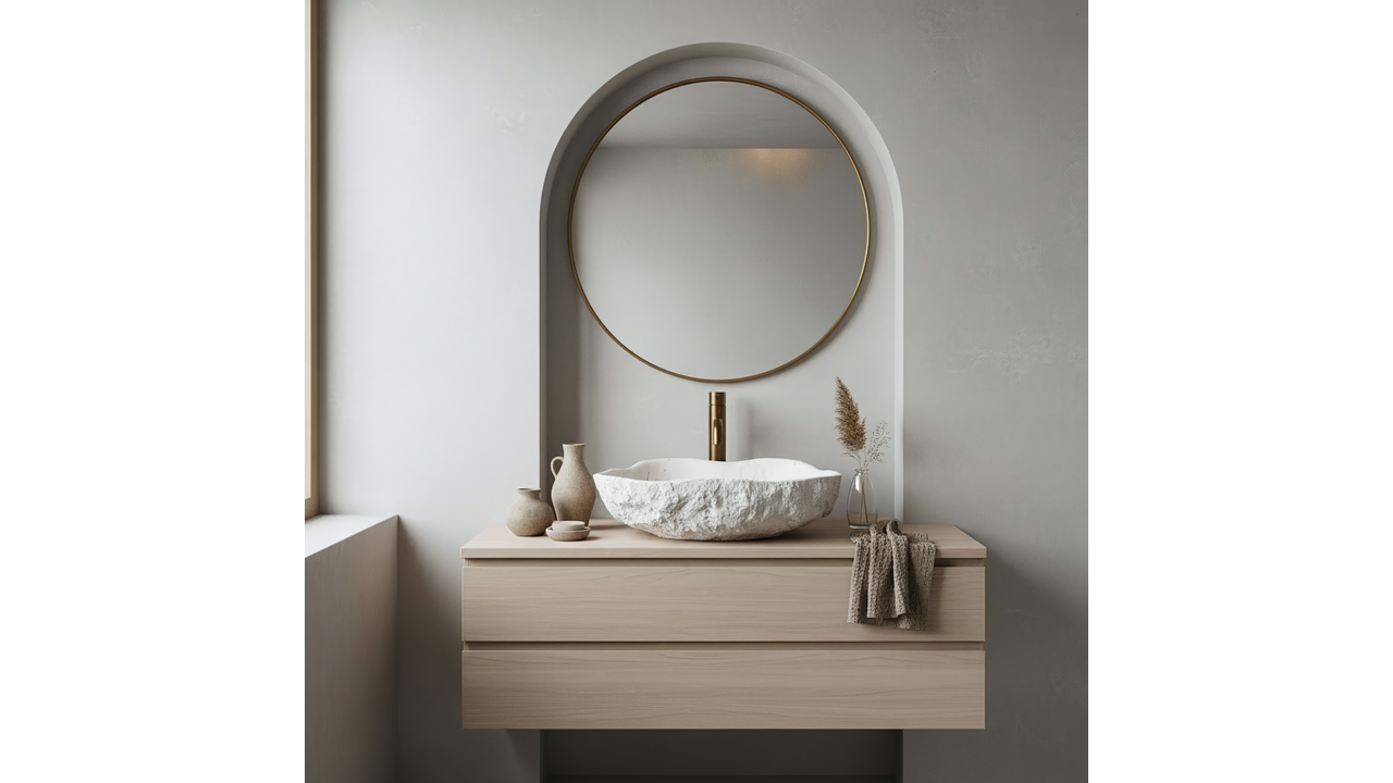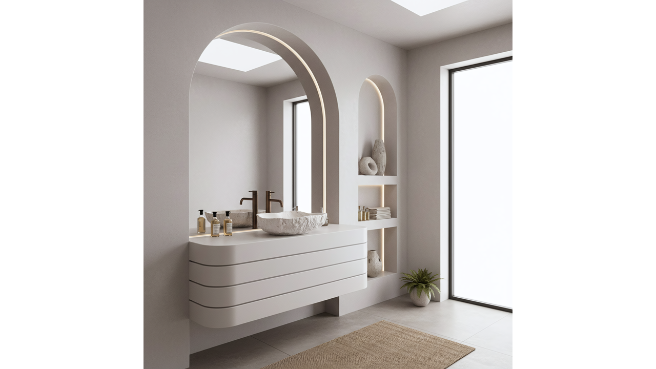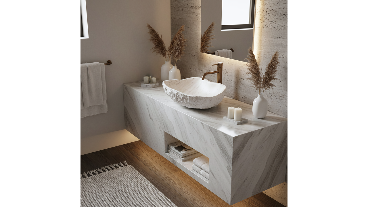 Умивалникът Rea Isla Shiro е отличен избор за бани в стил бохо, spa и модерен. Комбинацията от органична форма и издръжливостта на композита го прави ефектен и практичен елемент, който разчупва геометричната строгост на интериора.