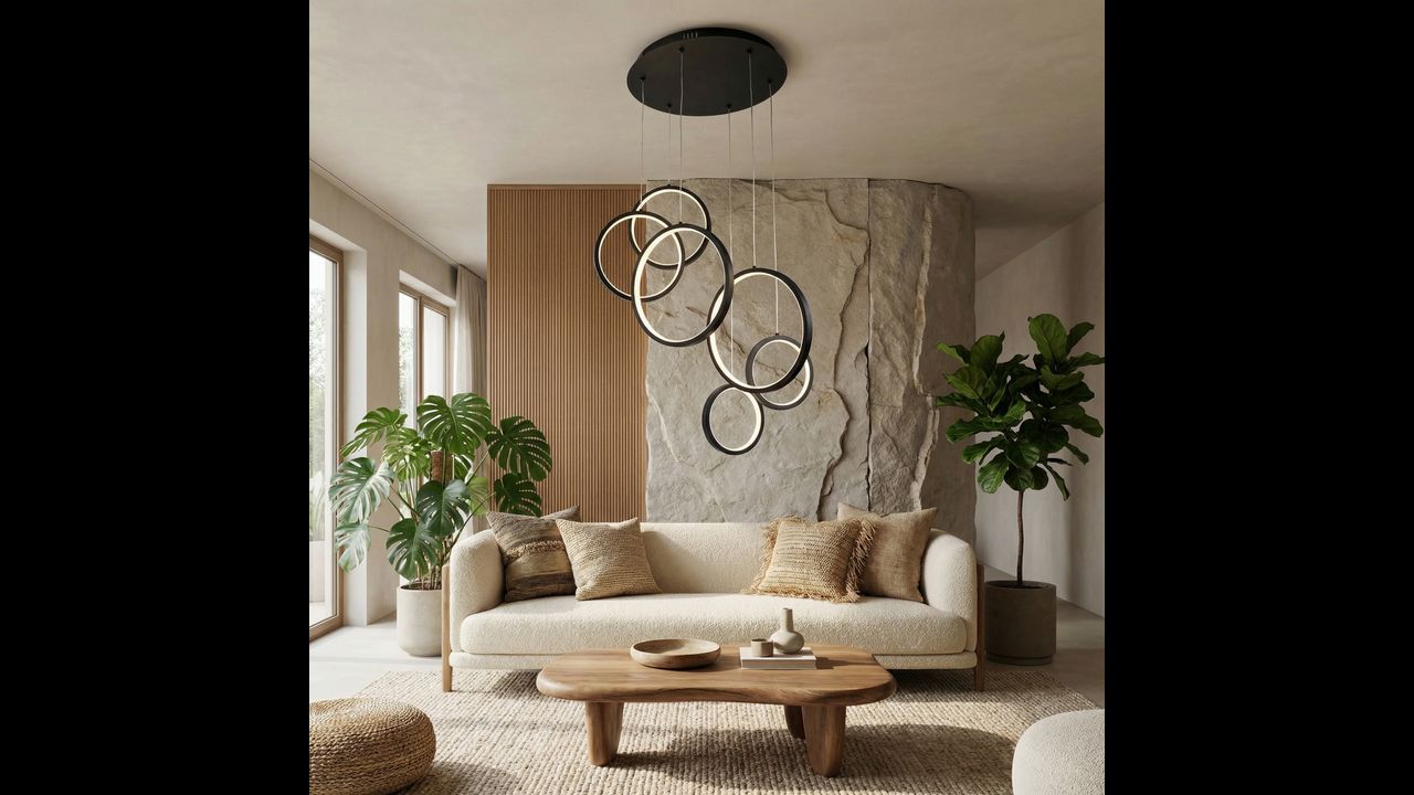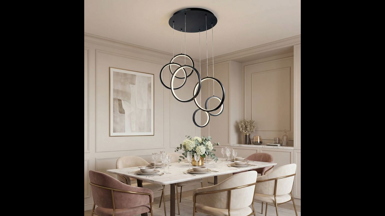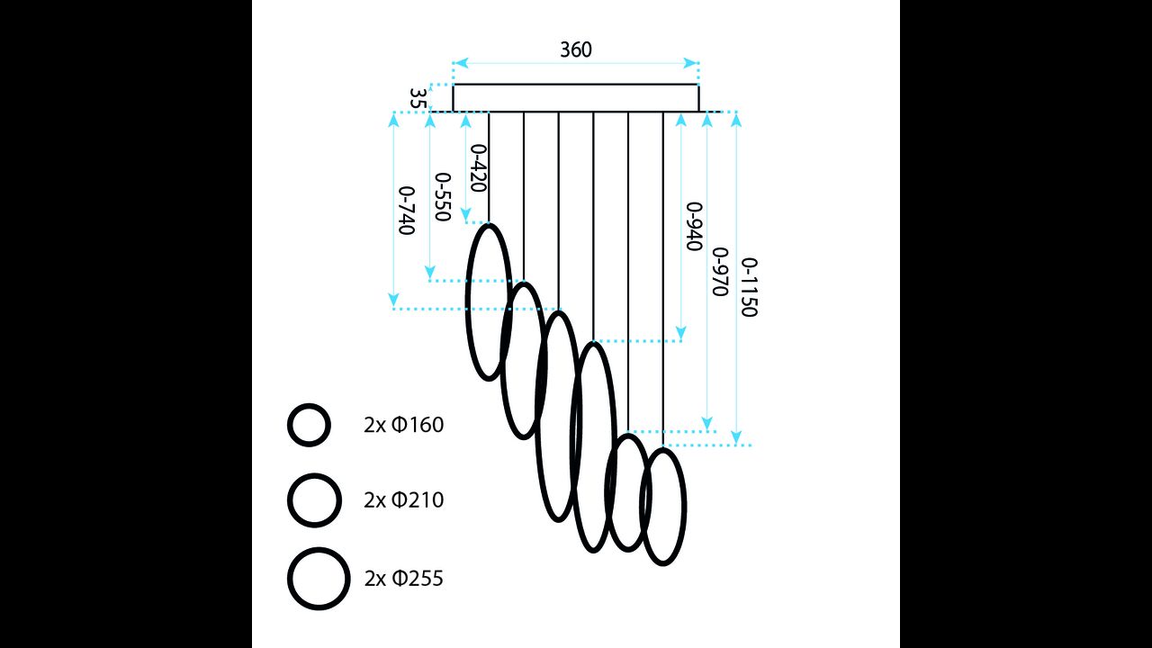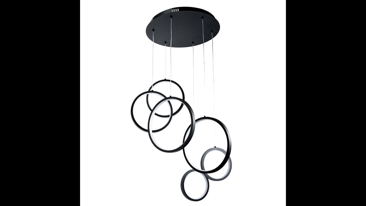 Висяща лампа с модерна геометрична форма е впечатляващо решение за минималистични и дизайнерски интериори. Композицията от няколко кръга с различни размери, разположени на различна височина, създава динамична пространствена структура, която привлича вниманието и придава лекота и съвременен характер на пространството. Черното покритие подчертава елегантността и се вписва отлично в актуалните интериорни тенденции.