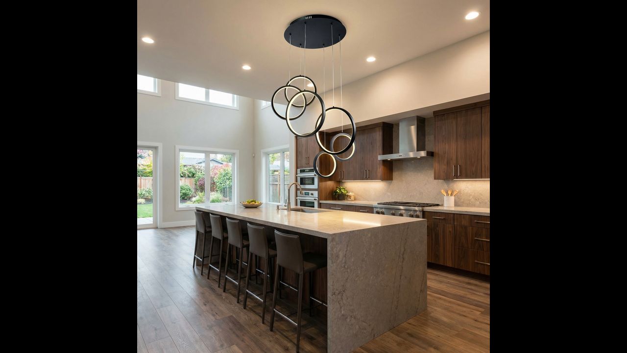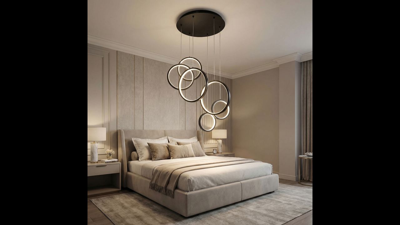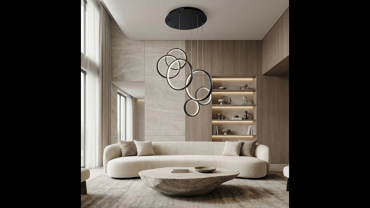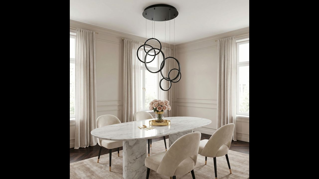 Висяща лампа с модерна геометрична форма е впечатляващо решение за минималистични и дизайнерски интериори. Композицията от няколко кръга с различни размери, разположени на различна височина, създава динамична пространствена структура, която привлича вниманието и придава лекота и съвременен характер на пространството. Черното покритие подчертава елегантността и се вписва отлично в актуалните интериорни тенденции.